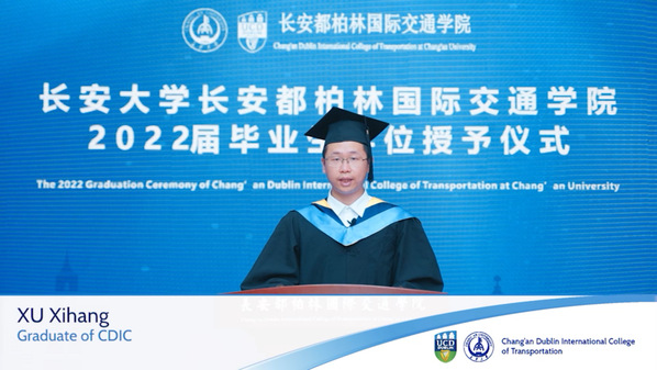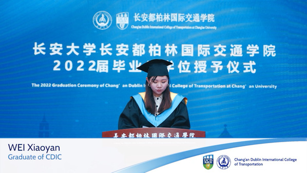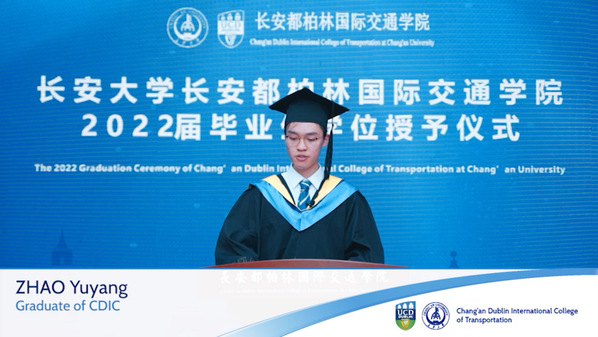 长安都柏林国际交通学院是开云kaiyun官网首个中外合作办学机构,旨在培养精通中西文化、具有国际视野与国际竞争力的复合型、创新型“新工科+大交通+国际化”高端技术和管理人才。学院2022届毕业生是开云kaiyun官网首届中外合作办学本科毕业生,学院已于2022年6月28日下午举行了2022届毕业生开云kaiyun官网学位线下授予仪式。今天,在全球疫情形势下,学院首届毕业生都柏林大学学位授予典礼采用线上直播的模式,师生家长共聚“云端”,共同见证都柏林大学授予学院2022届本科毕业生都柏林大学学位的光荣时刻,为学院首届中外合作办学毕业生的大学生活画上圆满的句号!