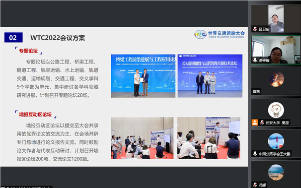 洪梓璇介绍了WTC2022会议筹备情况。本次大会由六个板块组成,分别是:开幕式暨主旨报告会、“一带一路”国际交通联盟系列活动、平行论坛、交通科技博览会、科技成果发布、奖赛活动等。她表示,大会将邀请行业内科研院所、企事业单位等加入,丰富会员单位参与形式,提升委员会社会声誉。