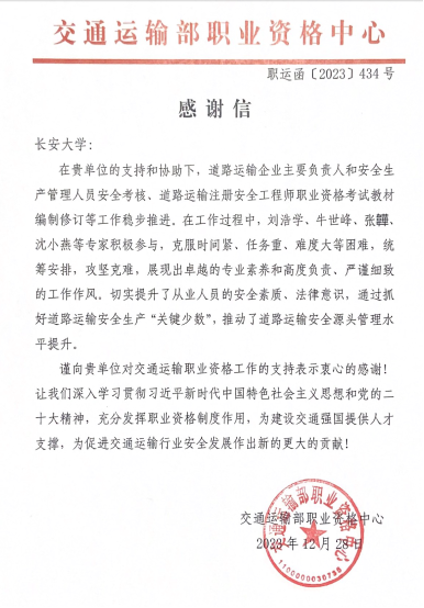 近日,交通运输部职业资格中心向开云发来感谢信,向开云及汽车学院4位教师对交通运输职业资格工作的支持表示衷心感谢。