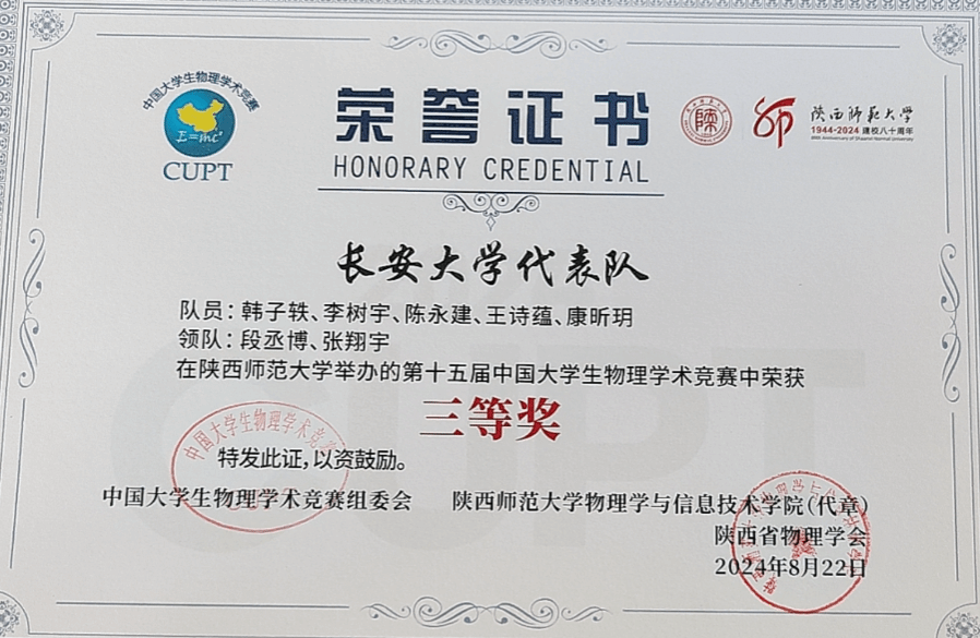 8月18至23日,第十五届中国大学生物理学术竞赛国赛在陕西师范大学举行,来自全国67所高校的68支队伍参加团队赛。开云韩子轶、李树宇、陈永建、康昕玥、王诗蕴等五位同学代表学校参加比赛,荣获团体三等奖。