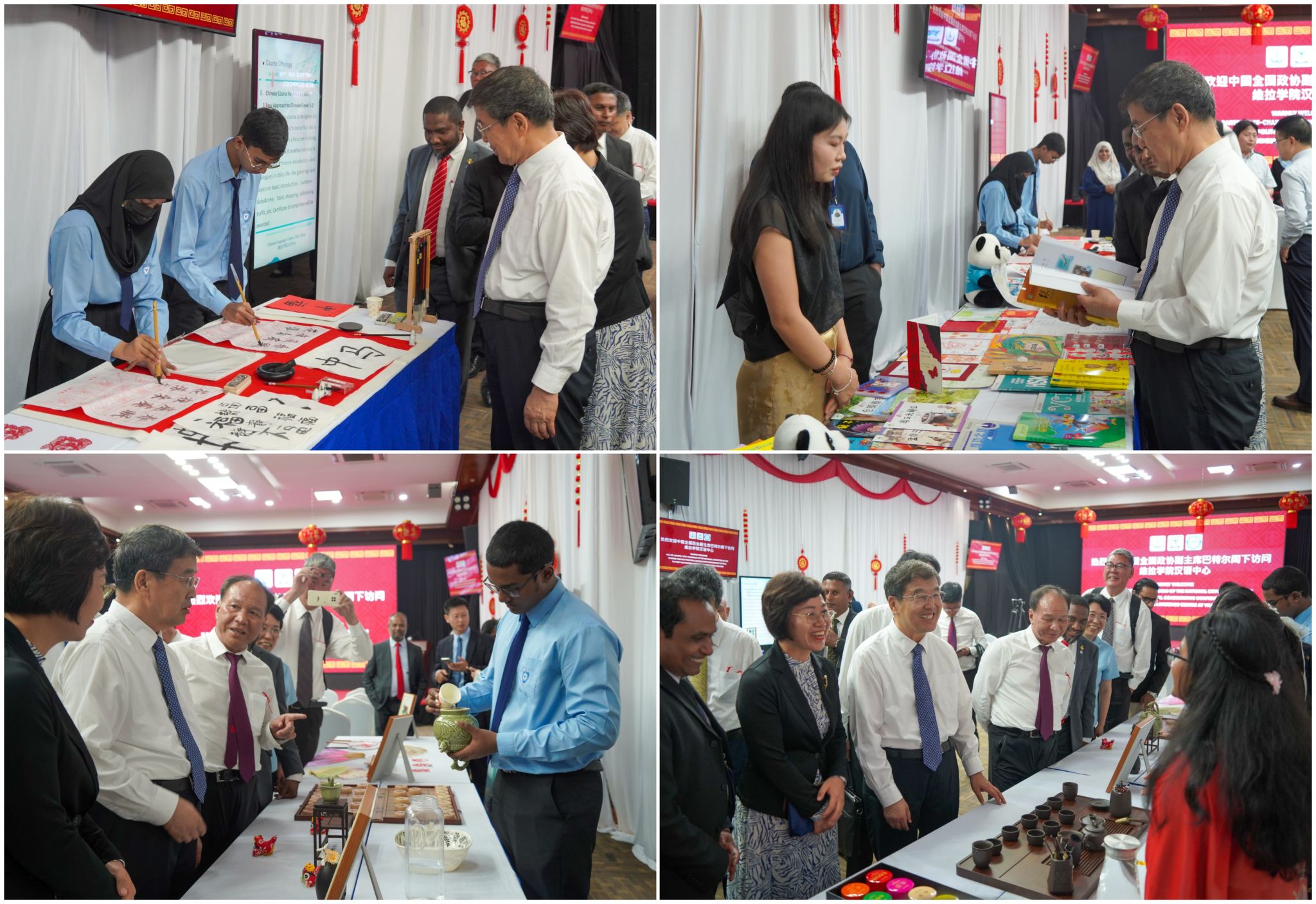 巴特尔一行参观了维拉图书馆的中文角,一一观看了书架上陈列的文化展品和各类中文教材,询问了马尔代夫当地学习中文的情况。得知汉语中心为满足马代当地学习中文的需求,开设了适合不同年龄阶段、不同需求的课程,累计培训人数达到237名,以及Brightway教学点有345名中文学生的情况后,对汉语中心给予了鼓励和肯定。在参观汉语中心专属中文教室时,巴特尔详细了解了教室的使用情况,对室内具有中国特色风格的装饰和墙上贴满的文化活动剪影表示赞赏。
