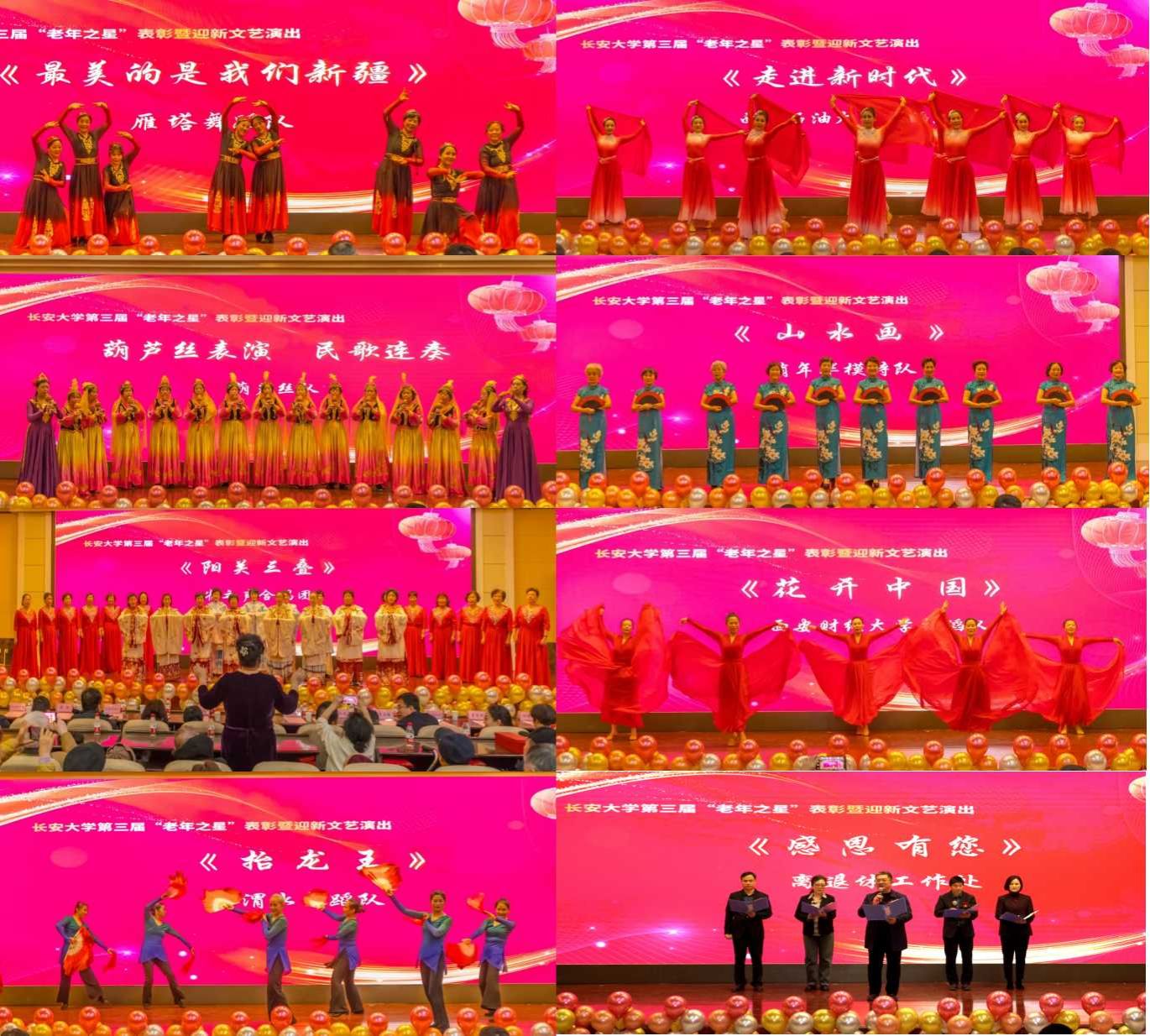 迎新文艺演出中,来自离退休工作处艺术团的合唱团、舞蹈队、模特队、葫芦丝队携手合作,精心编排表演《最美的是我们新疆》《民歌连奏》《抬龙王》《山水画》《阳关三叠》等多种形式的节目,特邀西安石油大学舞蹈《走进新时代》、西安财经大学舞蹈《花开中国》进行交流,处班子成员集体朗诵《感恩有您》将现场氛围推向高峰。