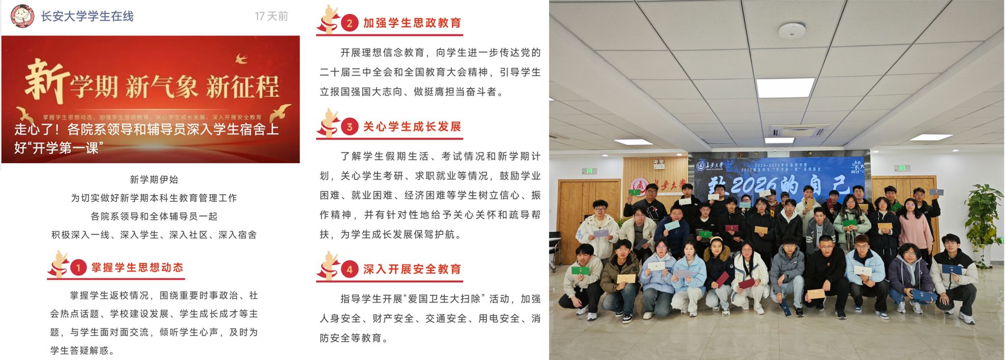 坚持以关心关爱学生为根本,用心用情护航学生健康成长。加强学风考风建设。针对开学季补考缓考,深入开展校纪校规宣传教育、案例警示教育等,引导学生诚信考试;深化榜样示范引领,组建起110余人的“长大之星”宣讲团并深入院(系)开展宣讲活动;深化朋辈学业帮扶,摸底学生期末考试、英语四六级考试等情况,以一对一(多)等方式,精准开展重点知识串讲、习题答疑等帮扶活动,开学一个月以来,已开展数学、英语、工程制图等公共基础课辅导173场次、覆盖学生3000余人次。加强心理健康教育。发布《春季学期学生心理健康教育工作提示》,全面细致了解学生心理健康状况,及时了解学生心理状态变化;通过谈心谈话、心理咨询、团体辅导、个别走访等方式,重点帮助学业困难、延期毕业、就业困难、家庭问题、经济困难、情感问题等学生树立信心、振作精神;开展“心理医生进校园”活动,邀请校外专家来校为学生提供及时、专业、便捷的临床评估与心理健康指导服务。加强学生安全和法治教育。依托晚点名/周见面、主题班会、线上推送等多种方式开展知识宣讲、案例分析和情景模拟,面向广大学生开展防火防盗、防不良网贷、防电信诈骗、防交通事故、防求职陷阱等安全教育,增强学生的安全意识和避险能力;结合第30个“世界防治结核病日”,开展结核病和校园常见传染病预防知识讲座,提高学生健康意识和防病能力;开展“文明宿舍”创建和“爱国卫生大扫除”等活动,积极营造环境整洁、安全文明、和谐融洽的宿舍文化氛围;做好7名学生春季应征入伍工作,并为其办理入伍停学、学费补偿等相关手续。