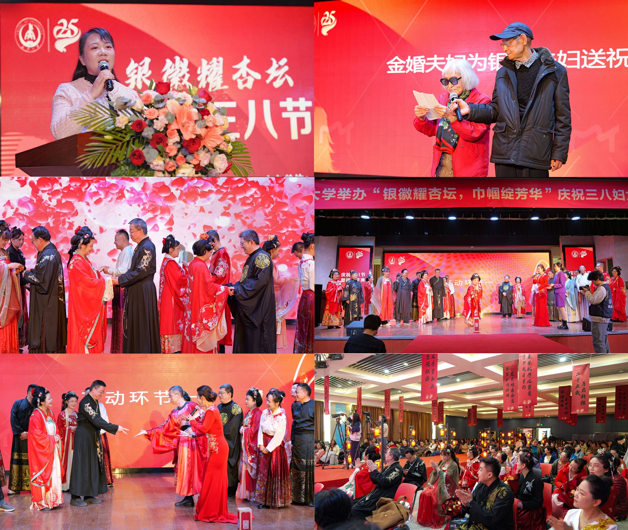 3月7日,在“三八”国际妇女节来临之际,为了致敬岁月里的坚守与浪漫,同时感恩教职工家庭的温暖付出,弘扬美好家风,增强全校教职工的凝聚力与归属感,学校在南校区东院雁博园四楼活动室举办“银徽耀杏坛,巾帼绽芳华” 庆祝三八节暨银婚庆典活动,十余对携手走过25余载风雨的教职工夫妇齐聚一堂,重温爱情誓言,共话岁月温情。全校300余名女教职工代表观看活动。