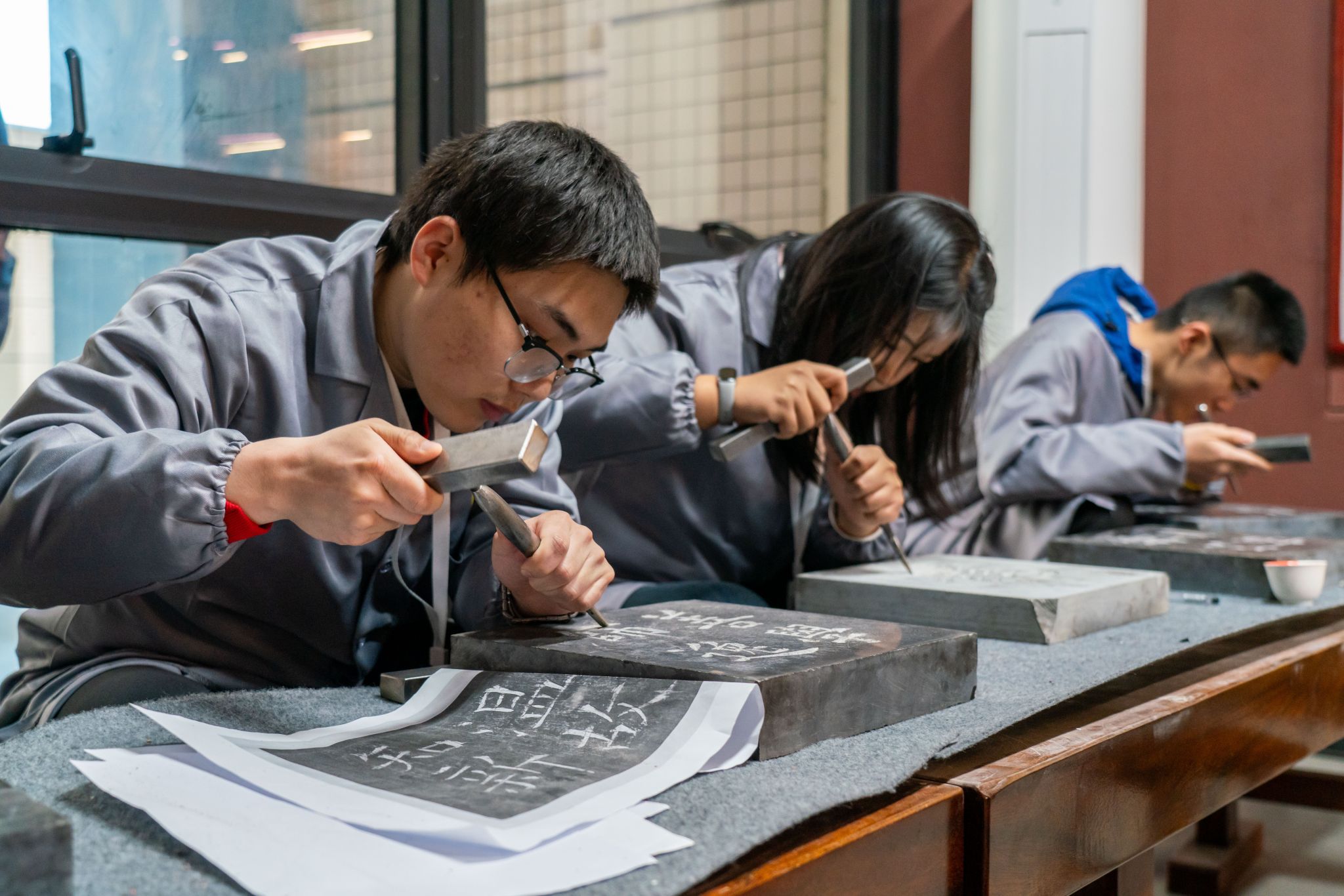 仪式结束后,嘉宾和师生们在学生讲解员的引导下,一同参观了石刻艺术馆。现场还开展了拓片、刻字等学生实践活动,学生们现场体验了传统碑刻的艺术魅力。