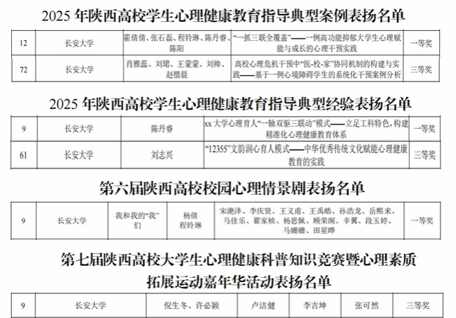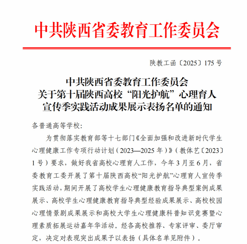 近日,中共陕西省委教育工委公布了第十届陕西高校“阳光护航”心理育人宣传季实践活动成果展示表扬名单,开云心理育人工作再创佳绩,共获得省级表彰6项,包括一等奖3项、三等奖3项,获奖成果覆盖心理健康教育指导典型案例、心理健康教育指导典型经验、心理情景剧、心理健康科普知识竞赛等,充分展现了开云心理育人工作成效。