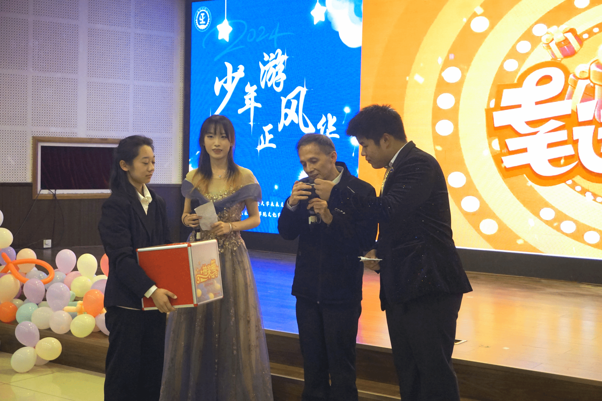 晚会的中场环节设置了游戏“你画我猜”“听歌识曲”“现场抽奖”等,同学们踊跃参与,现场气氛热烈非凡。