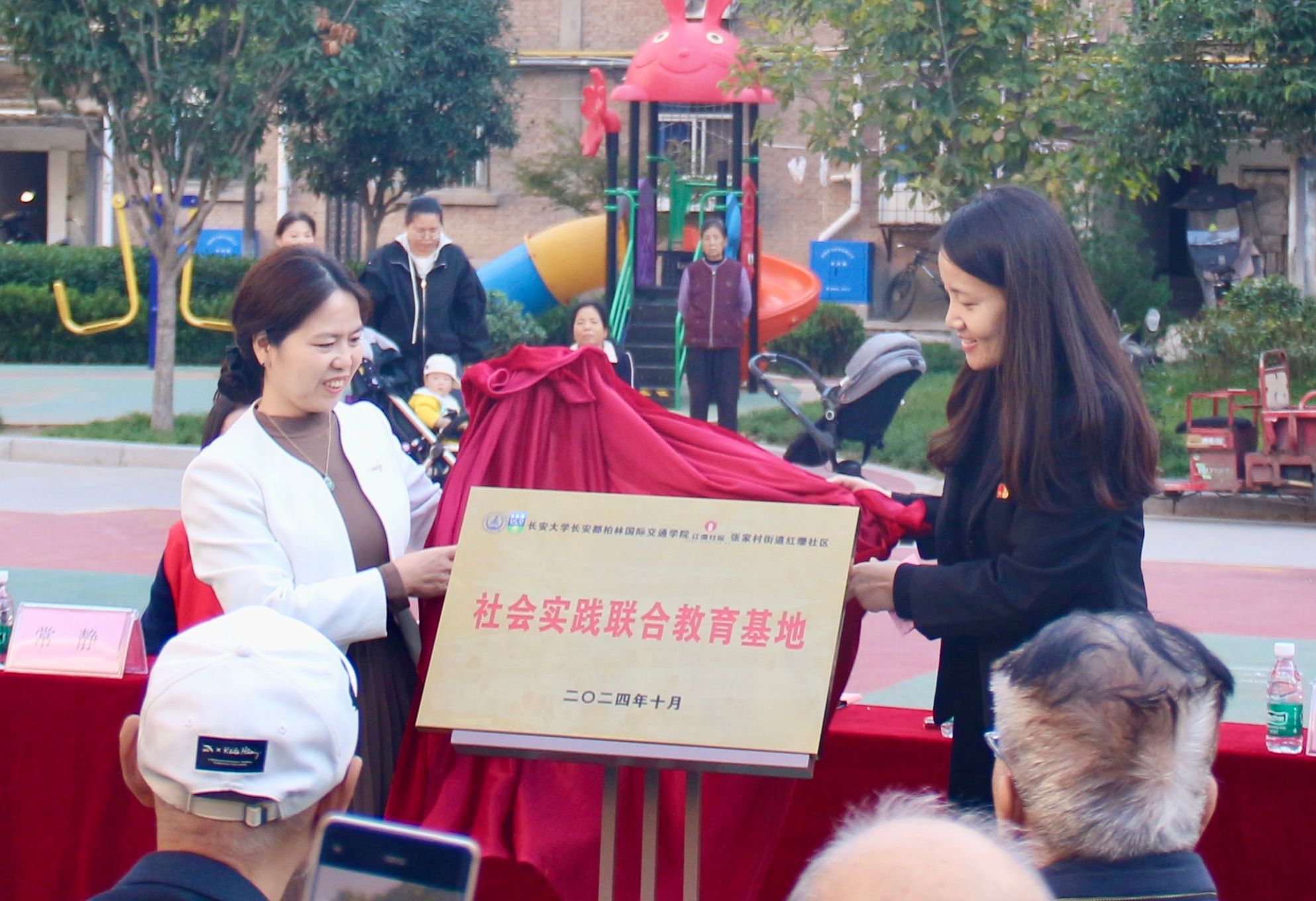 活动后,张艳萍和郑倩共同为长安都柏林国际交通学院与红缨社区共建社会实践基地揭牌。