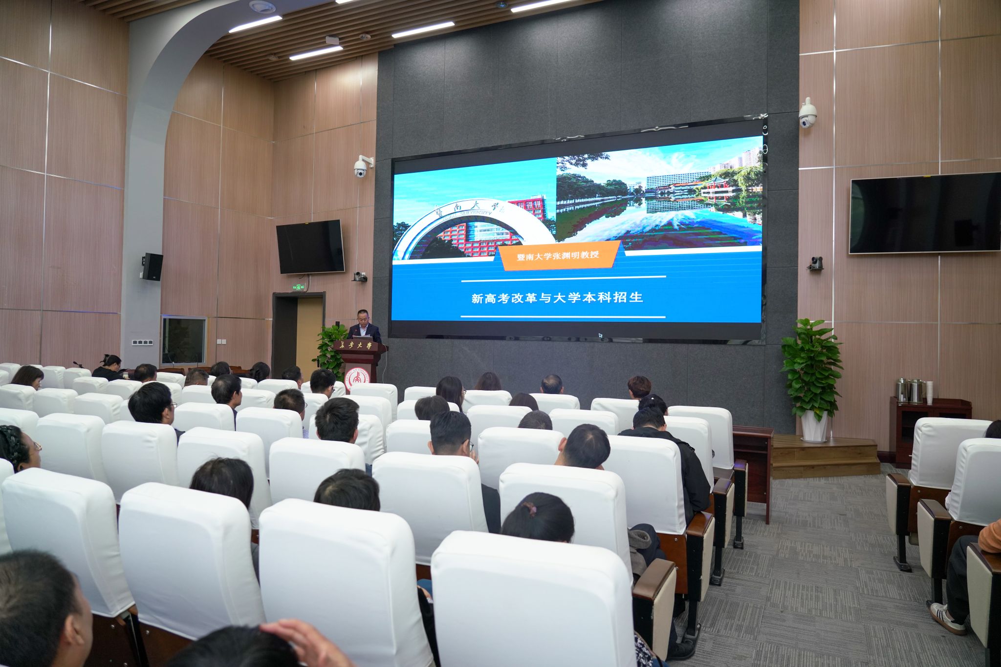 讲座由暨南大学教授、博士生导师张渊明老师主讲。他从新高考改革政策概述、新高考下的机遇和挑战、新高考下的招生宣传工作三个方面分享了在中国高考综合改革、高校学科专业优化、专业组设置、高校招生策略、高中生生涯规划与选科指导等方面的多年研究经验,对2024年全国和陕西省高招数据进行了复盘,深入分析了各省新高考改革政策内涵和现状。针对开云kaiyun官网实际情况,张渊明教授援引其他兄弟高校、高考综合改革省份高校和同行业院校的多重应对案例,对学校2025年本科招生专业组设置、考生志愿填报策略、招生宣传成效提升进行了精准的指导,对招生工作的提升提出了中肯的建议。