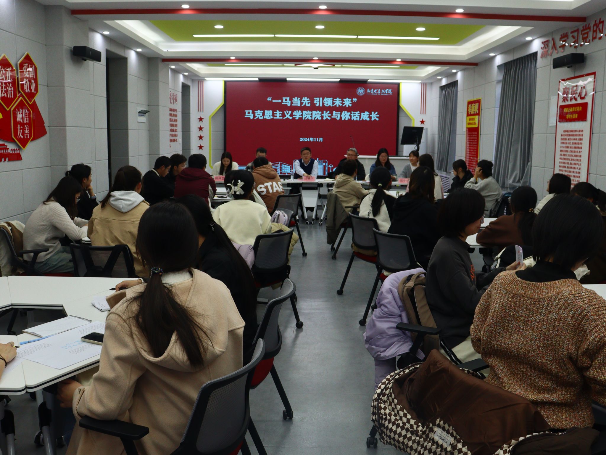 为切实做好新生教育工作,加强专业认知、学业规划和职业规划教育,增强学生的专业认同感、归属感,引导学生做好学业生涯、职业生涯规划,帮助新生“入好门、走好路、学好业、成好才”,11月27日,马克思主义学院在学校思政课虚拟仿真体验教学中心举办“一马当先·引领未来”院长与你话成长座谈交流活动。院长陈怀平、院党委副书记冯迪、院学办副主任秦丰、全体辅导员以及学院2024级本科生代表参会。会议由冯迪主持。