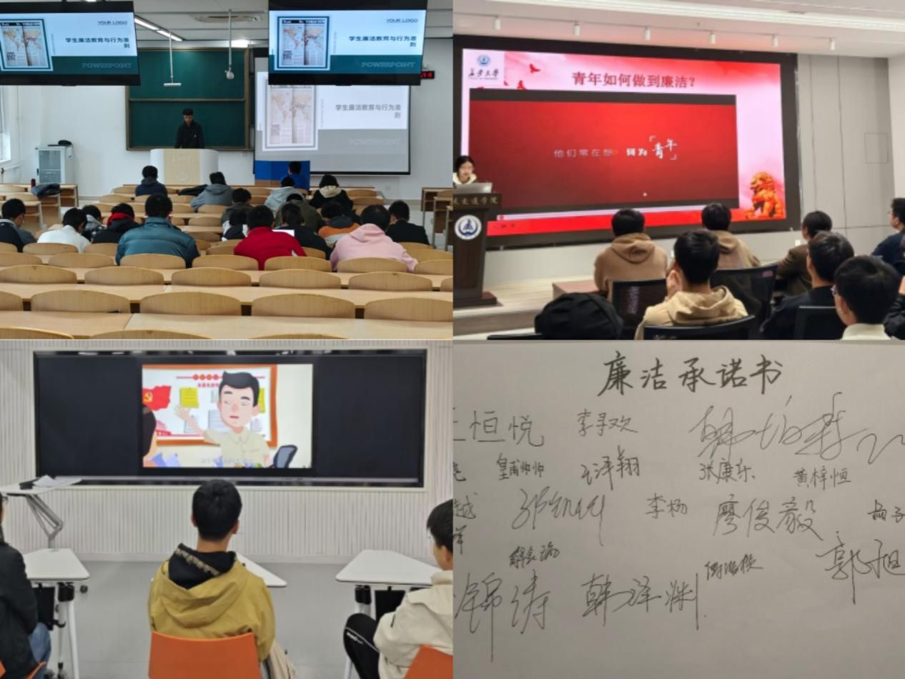 思想崇廉,筑牢廉洁根。廉洁文化建设是一项长期系统工程,学院始终将廉洁教育视为人才培养的关键组成部分。学院副院长汤颖颖面向新生讲授廉洁教育专题思政课,帮助新生扣好人生“第一粒扣子”;本科新生辅导员在周见面上以廉洁教育为主题开展本科新生入学适应教育,结合具体案例引导学生将廉洁自律与学习生活紧密结合;班主任、班级朋辈导师以廉洁为主题,引导学生筑牢信仰之基、补足精神之钙、把稳思想之舵;各班召开诚信考试专题班会,深入学习《开云kaiyun官网学生管理一般规定》《开云kaiyun官网学生违纪处分规定》等文件,严明考规考纪,发挥廉洁文化教育的引导激励浸润作用。