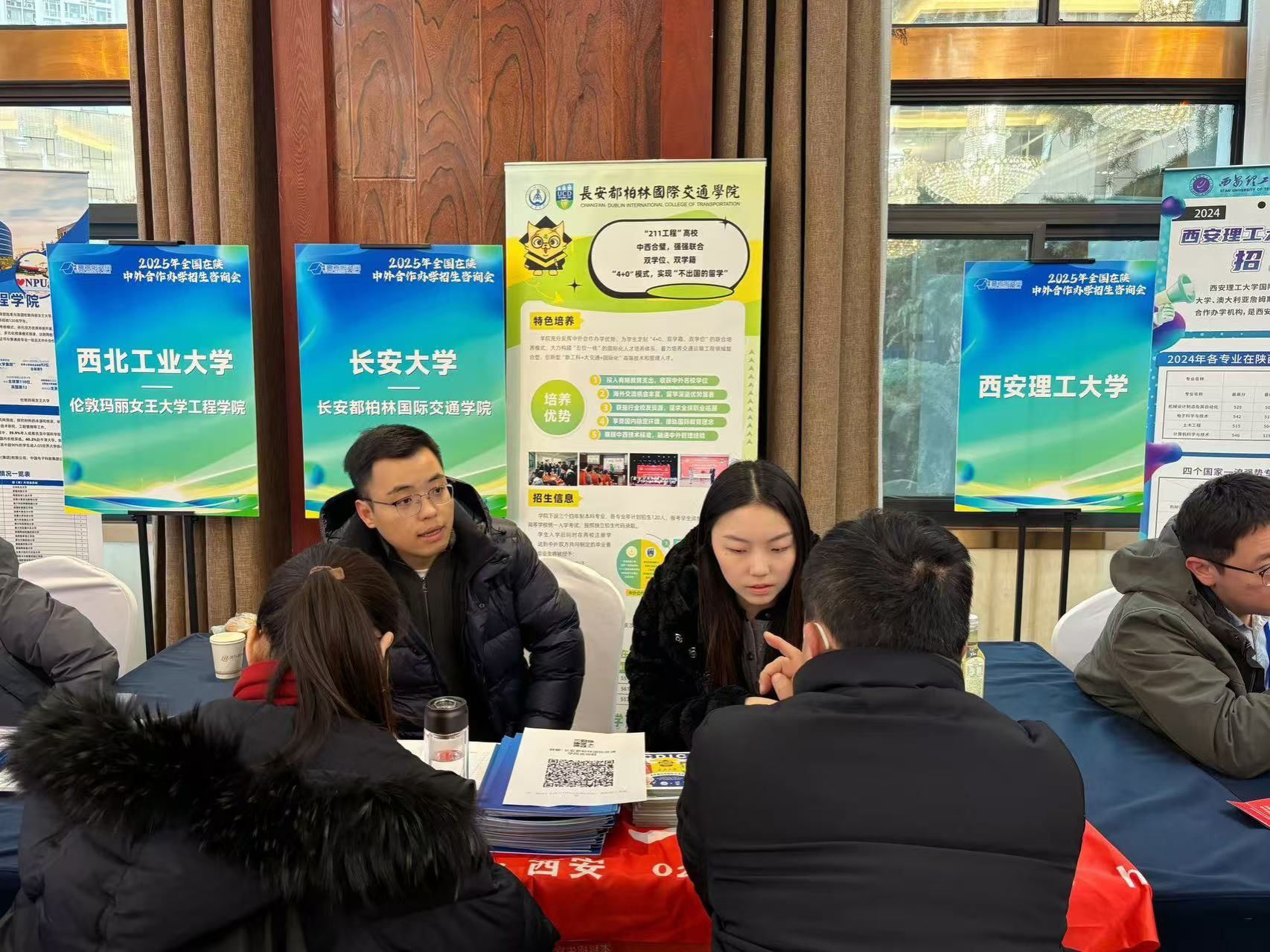 为进一步扩大学院影响力,稳步推进2025年招生工作,12月22日,长安都柏林国际交通学院张力雄、陈鹿姿参加了由陕西高考服务网主办的2025年全国在陕招生中外合作办学专场咨询会。此次活动汇聚了西安交通大学、西北工业大学、同济大学等近三十所知名院校的中外合作办学机构(项目),吸引了陕西省各高中的300余名家长和考生参与。