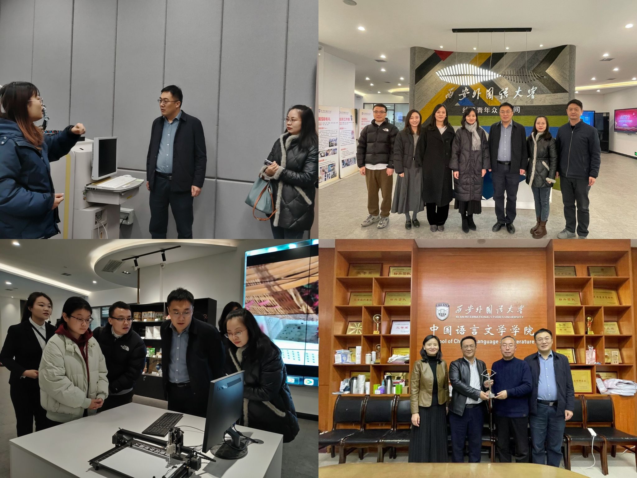会后,代表团一行前往西安外国语大学人工智能与语言认知神经科学重点实验室、丝路青年众创空间实地调研,参观智语实验室各个实验平台,了解该校创新创业教育和大学生自主创业相关工作。