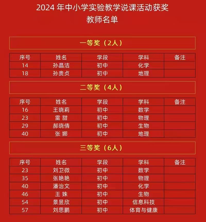 在雁塔区教育局开展的2024年中小学实验教学说课活动中,附属中学荣获一等奖2人、二等奖4人、三等奖6人,学校荣获“优秀组织奖”。