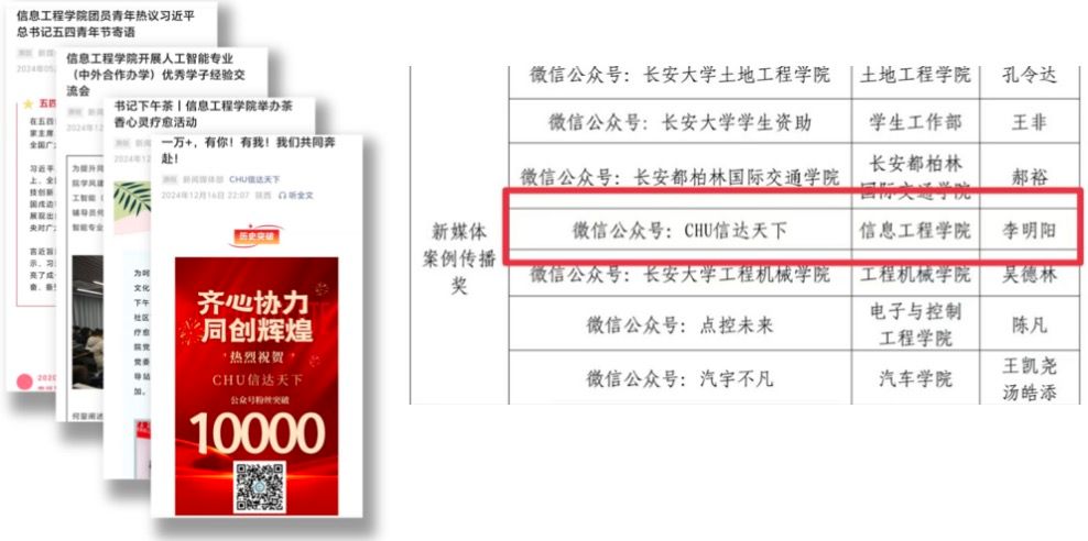深耕网络思想阵地,多平台协同强化舆论引导效能。全年共在各类新媒体平台推送稿件800余篇,阅读量34万人次,学院微信公众号“CHU信达天下”关注数破万,获“新媒体案例传播奖”。以树典型模范为抓手,强化榜样引领的灯塔效应。依托“榜样的力量”“青年说”“热议”系列等特色品牌宣传栏目,充分发挥先进典型的思想引领和道德示范作用。