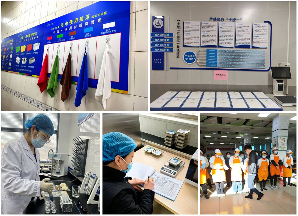 践行“十统一六到位”模式,严控食品安全过程管理。按照陕西省市场监管局要求,全面落实食品安全“十统一六到位”管理模式,确保学校食堂食品安全规范化、标准化。一是严格落实进货查验制,在监控区实行“双人或多人联检”食品原料,确保达标。原材料配送专人专车,杜绝交叉运输,同时建立记录制度,做好进货台账与索证索票。二是严格执行餐用具清洗消毒制度,按要求做好餐用具清洗消毒记录。快检室每周不定时抽检餐用具。三是专人负责食品留样工作,每餐次食品品种全留样且不少于150克,留样柜实施“双人双锁”。四是严格落实从业人员健康管理制度,员工持健康证上岗,每日进行晨午检,建立健康档案,详实记录员工健康状况。五是优化有害生物防制体系,检查维护防虫、防鼠、防蝇设备,封堵孔洞缝隙,日清餐厨垃圾,第三方消杀公司定期消杀餐厅环境与虫鼠害。