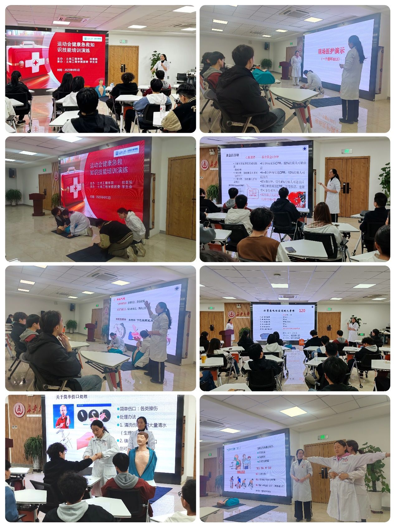 本次活动邀请校医院中医科医师、陕西省体育科学学会体医融合专业委员会委员、陕西省全科医学专业委员会委员、美国心脏协会“拯救心脏”急救课程导师齐梓伊主讲。她凭借丰富的专业知识和临床经验,详细讲解心肺复苏、海姆立克急救法、外科及内科常见急症的健康知识与技能。重点对心肺复苏及自动体外除颤仪(AED)的适应症、操作方法、注意事项等进行深入讲解,强调在遇到心脏骤停等紧急情况时,及时有效的心肺复苏对于挽救生命的重要性。针对阳光体育运动,她讲解了出血包扎、运动性低血糖、常见损伤处理、窒息和气道异物阻塞、过敏等常见内外科疾病的院前急救知识、急救常备药物,帮助同学们掌握在突发紧急情况下如何正确处理的技能。她还介绍了常见运动损伤后的缓解方法,如冰敷、压迫、抬高患肢等,帮助同学们在运动前后做好自我保护。在培训讲解过程中,医护人员还示范指导同学们进行现场实操演练,亲身体验,更加深刻理解急救知识的重要性和操作要点。