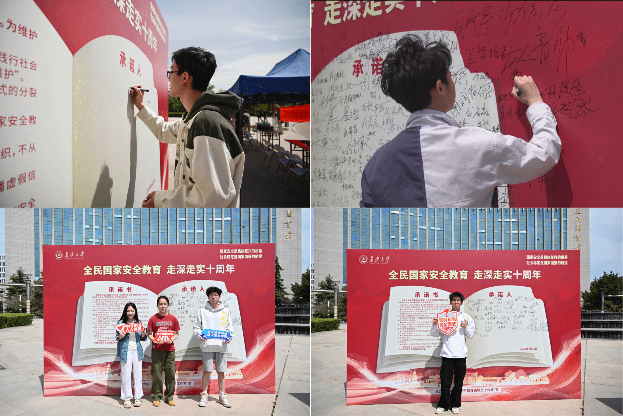 4月15日当天,工作室在图书馆前设置国家安全承诺签名墙,邀请全校师生庄严签名承诺,共同为维护国家安全贡献力量。学校保卫处提前印制好关于全民国家安全教育日、保密法、反邪教知识等宣传知识手册,联合工作室成员向师生发放并宣讲,帮助活动参与师生深刻认识国家安全的重要性,筑牢校园安全防线。活动期间,工作室还为参与师生精心准备了纪念帆布袋、钥匙扣、冰箱贴等国家安全主题纪念品,学校、学院多位领导老师走进活动现场,与同学们一同学习国家安全知识。