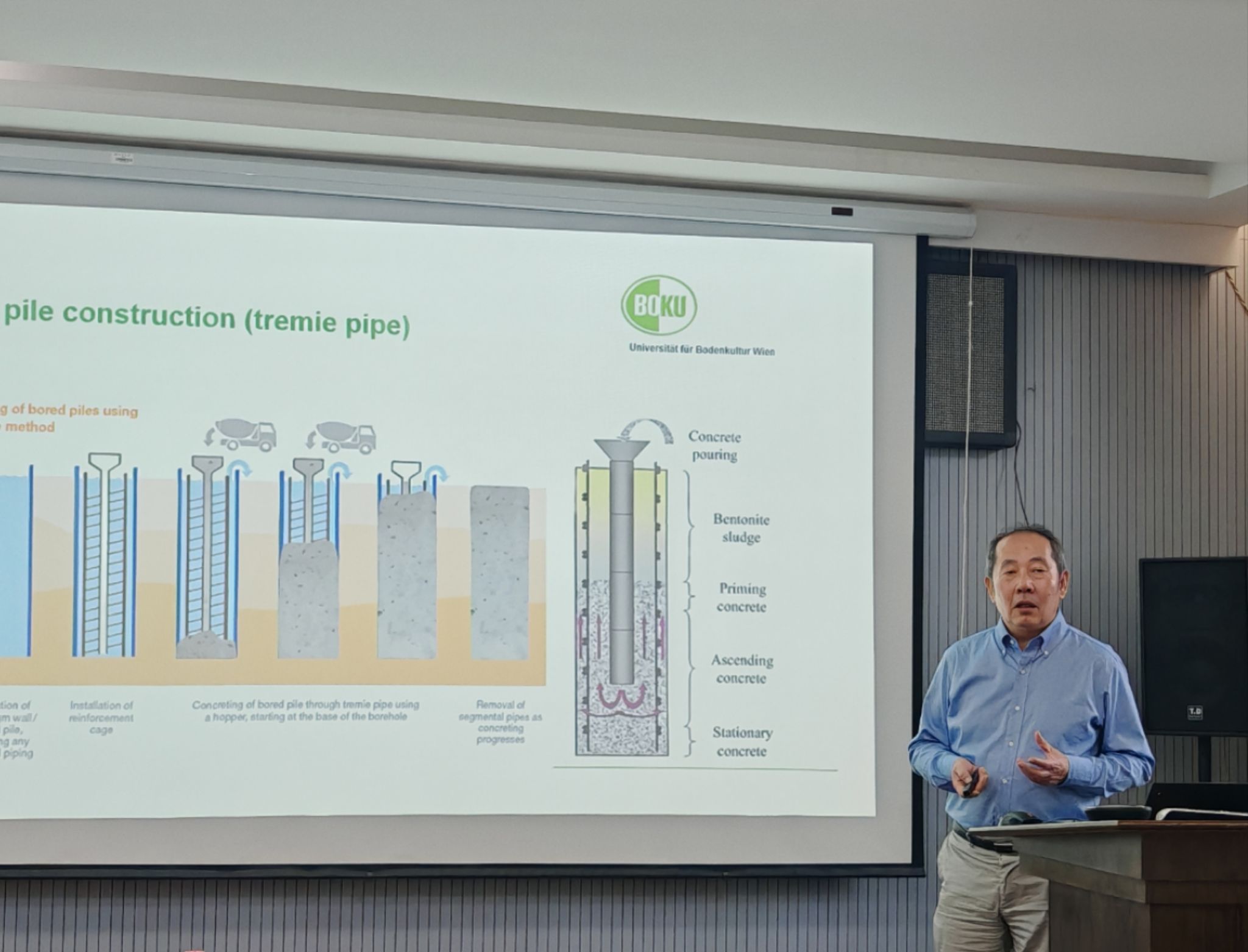 4月21日上午,吴伟教授为师生作题为“Recent study on quality of bored piles”的学术报告,介绍了团队在过去十年中关于新拌混凝土泌水问题的研究工作,重点分享了灌注桩中混凝土孤立波的试验验证及数学解析的研究成果。报告结束后,与会师生与吴伟教授围绕相关学术问题进行深入探讨。
