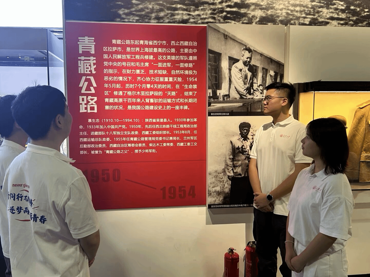 实践队在青海省博物馆感悟青海地域文化与“两路”精神的交融魅力,传承民族团结与奋斗基因。青藏公路纪念馆内陈列的筑路官兵鞋袜、慕生忠将军手书等珍贵文物,让队员们触摸到“以骨为桩、以血为沥青”的筑路史诗。