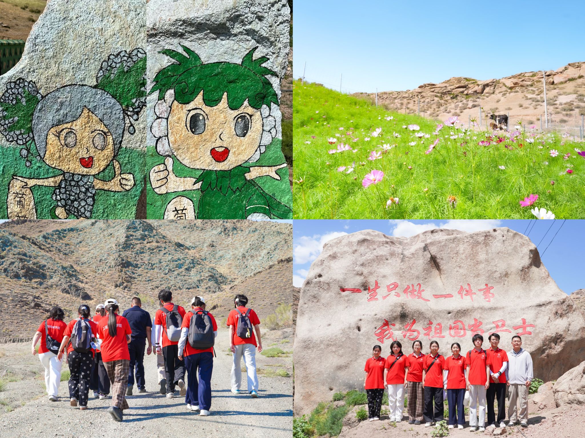 戍边为责,体悟国土寸土不让的担当。实践队深入边境哨所与警务站,在狂风与戈壁间,亲身感受戍边人熔铸于血脉的忠诚与坚守。81团塔拉夏沟哨所通往第五师双河市边防指挥中心的道路两侧,鲜花与向日葵织就花带,石头上的吉祥物和彩绘石上细腻勾勒的戍边故事,诠释着兵团人的坚守。在90团阿拉山口哨所,队员们沿着崎岖山路登上瞭望塔远眺边境线,亲身体验戍边人的坚守。89团小喀拉达坂边境警务站里,实践队员学习了上海支边女青年沈雅琴的故事,并参观戍边生活区,队员们明白了戍边不仅是守护国土,更是用双手创造美好生活的担当。