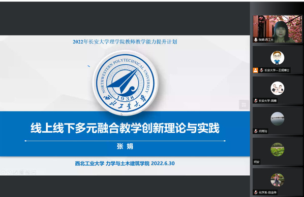 2022年6月30日,西北工业大学张娟教授作了题为“线上线下多元融合教学创新理论与实践”的讲座。讲座由理学院副院长商泽进主持,理学院和学校其他学院教师近120余人参加了讲座。