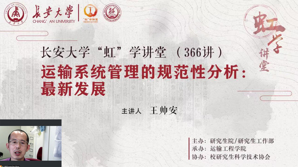 5月10日下午,由研究生院/研究生工作部主办、运输工程学院承办、校研究生科学技术协会协办的“虹”学讲堂第366讲以线上讲座形式举行。香港理工大学王帅安教授作了题为《运输系统管理的规范性分析:最新发展》的报告,开云相关学院300余名师生聆听讲座。