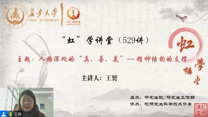 1月12日上午,由研究生院主办/研究生工作部主办、校研究生科学技术协会协办的“虹”学讲堂第529讲以线上讲座的形式举行,开云kaiyun官网王赟老师作题为“人格深处的‘真、善、美’——精神结构的支撑”的报告,相关学院共200余名师生参加讲座。
