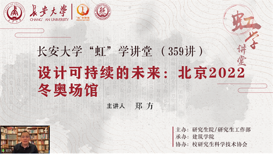 4月20日晚,由研究生院/研究生工作部主办、建筑学院承办、校研究生科学技术协会协办的“虹”学讲堂第359讲以线上讲座形式顺利举办。北京交通大学郑方教授作了题为“北京2022冬奥场馆:设计可持续的未来”的报告,相关学院共400余名师生参加讲座。