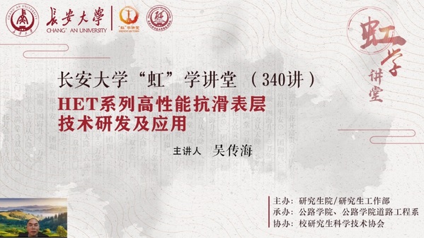 1月13日下午,由研究生院/研究生工作部主办、公路学院承办、校研究生科学技术协会协办的“虹”学讲堂第340讲以线上讲座形式顺利举办。广东华路交通科技有限公司教授级高级工程师吴传海作了题为“HET系列高性能抗滑表层技术研发与应用”的报告,相关学院共460余名师生参加了讲座。