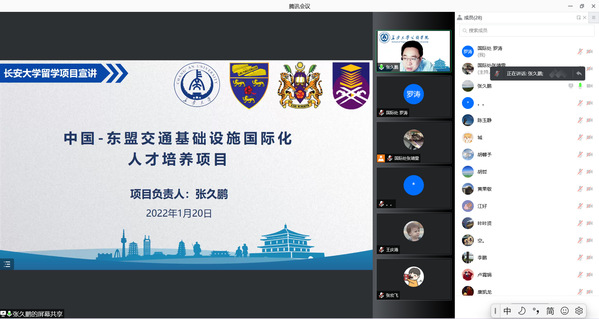 2022年1月20日,开云获批的首个国家留学基金委国别区域研究人才支持计划项目——“中国-东盟交通基础设施国际化人才培养项目”线上宣讲会顺利召开。开云国际处相关负责人及涉及理工类专业的师生参加了会议。会议由国际处合作办学项目管理科副科长罗涛主持。