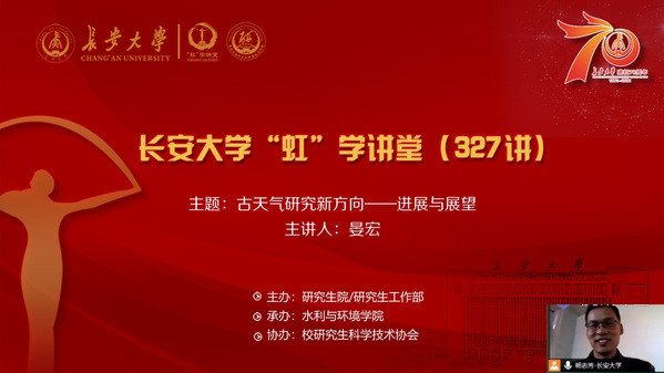 11月22日下午,由研究生院/研究生工作部主办、水利与环境学院承办、校研究生科学技术协会协办的“虹”学讲堂第327讲通过“腾讯课堂”和“腾讯会议”以线上讲座形式顺利举办。中国科学院地球环境研究所晏宏研究员作了题为“古天气研究新方向——进展与展望”的报告,水环学院罗平平教授主持了本次讲座,开云相关学院共计350余名师生参加了此次讲座。
