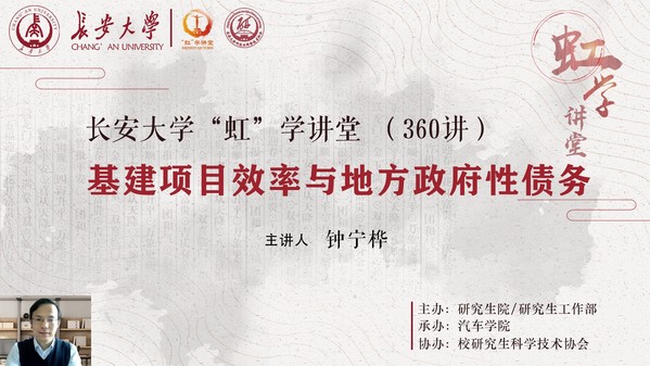 4月21日上午,由研究生院/研究生工作部主办、汽车学院承办、校研究生科学技术协会协办的“虹”学讲堂第360讲以线上讲座形式顺利举办。同济大学钟宁桦教授作了题为“基建项目效率与地方政府性债务”的报告,相关学院共350余名师生参加讲座。