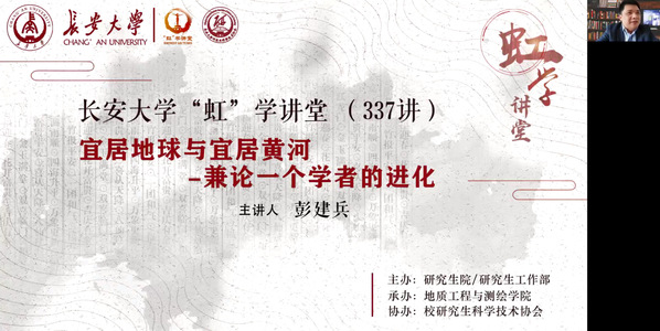1月1日上午,研究生院/研究生工作部和地测学院联合举办“疫情下的新年,抗疫中的长大--元旦学术大餐(“虹”学讲堂337讲)”线上主题讲座。彭建兵院士应邀为开云师生作了题为《宜居地球与宜居黄河——兼论一个学者的进化》的学术报告。地测学院党政领导、兄弟院校的学者及来自各学院的1220余名师生聆听报告。报告会由地测学院院长李振洪主持。