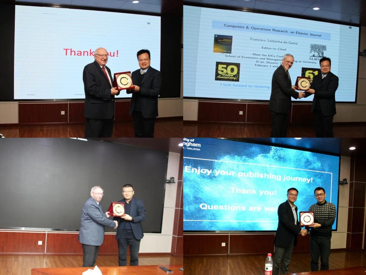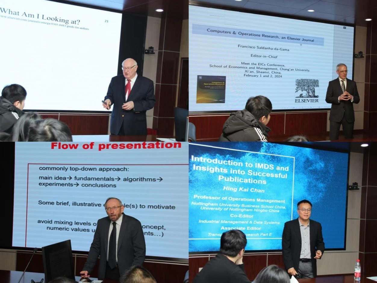 在期刊介绍环节,4位主编分别从各自期刊概况、最新关注话题、投稿审稿流程、研究与写作注意事项等方面进行面对面交流。杜强、李想等向主编赠送长大经管徽章,表达主办单位对各位主编拨冗莅临指导的衷心感谢。在学术报告环节, Prof. Francisco、Prof. Witold、Prof. Hing Kai Chan分别作了题为《A Unified Data and Knowledge Environment of Machine Learning: Fostering New Development Horizons》《Humanitarian supply chain planning: the effect of location decisions on fair allocation of donations》《Planning and Design of Dry-Port-Based Multimodal Transportation Networks subject to Disruptive Events》的学术报告。与会青年教师、研究生等与主编、专家进行学术讨论与互动。