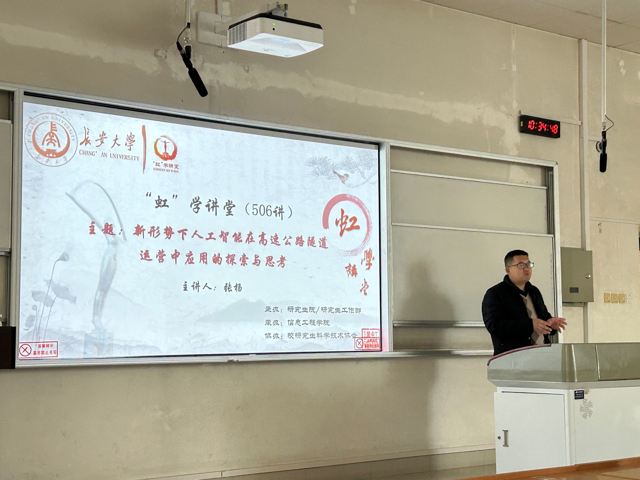 11月16日上午,由研究生院/研究生工作部主办、信息工程学院承办、校研究生科学技术协会协办的“虹”学讲堂第506讲在北校区明远教学楼2201教室举行。天台山隧道管理中心高级工程师张杨作题为“新形势下人工智能在高速公路隧道运营中应用的探索与思考”的报告,相关学院共240余名师生参加讲座。