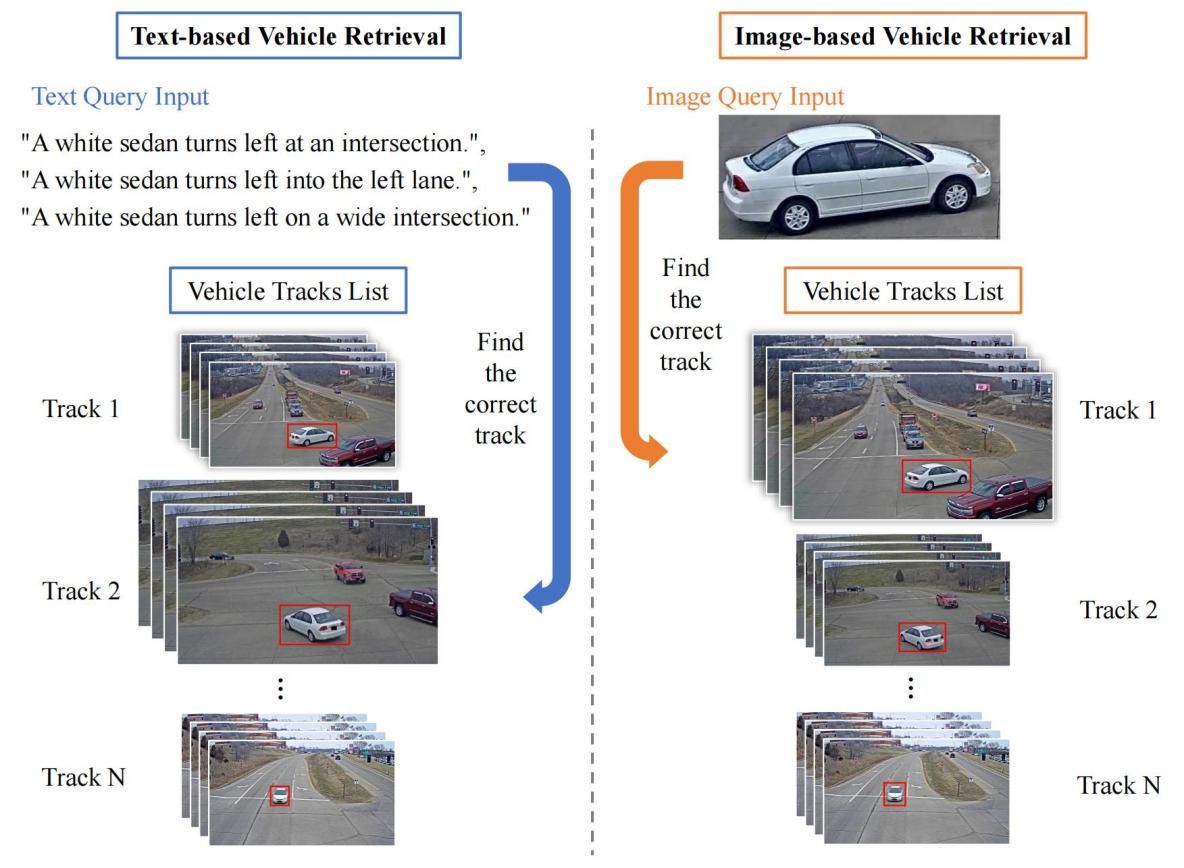 图1.基于自然语言和基于图像的车辆检索方法流程对比