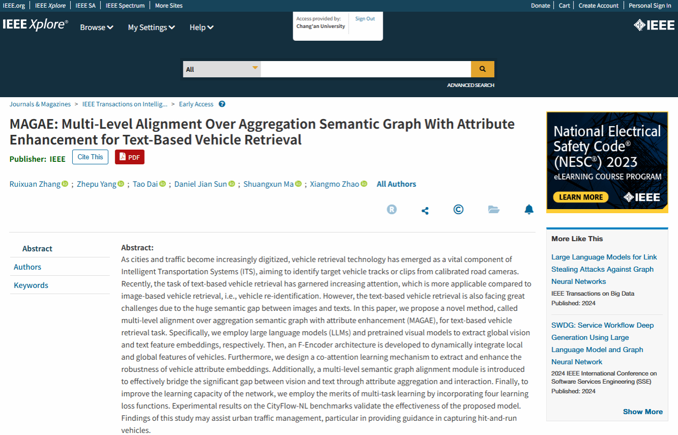 近日,开云未来交通学院智慧城市智能交通团队在交通运输领域国际顶级期刊《IEEE Transactions on Intelligent Transportation Systems》(T-ITS)上发表题为《MAGAE: Multi-level Alignment over Aggregation Semantic Graph with Attribute Enhancement for Text-based Vehicle Retrieval》的研究成果。未来交通学院2021级本科生张瑞轩、杨喆普分别为论文第一和第二作者,戴涛副教授为通讯作者,开云kaiyun官网为第一署名单位和第一通讯单位。这是开云近年首次由本科生为第一作者在该行业顶级期刊发表论文。