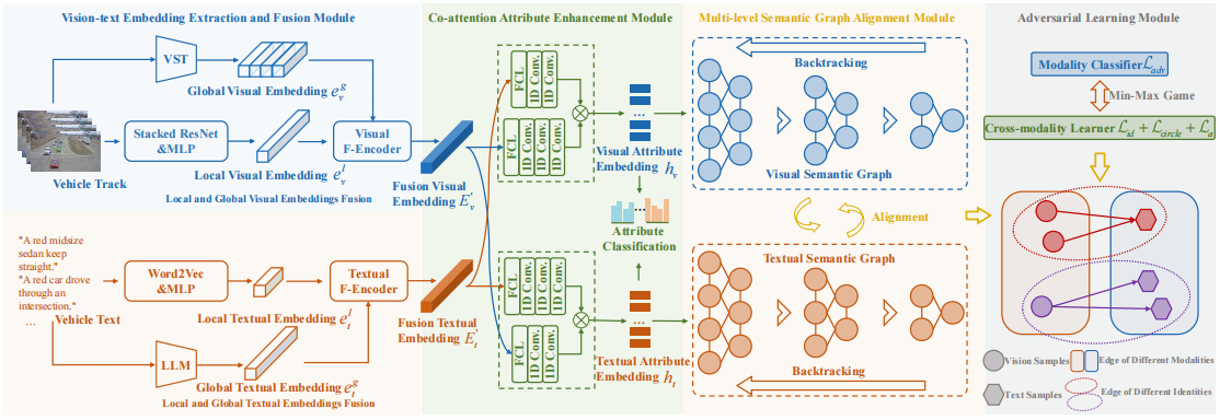 研究采用大型语言模型(LLMs)和预训练视觉模型提取自然语言和全局视觉的特征嵌入,提出了一种全新用于动态集成车辆局部和全局特征的F-Encoder架构,设计了一种协同注意力学习机制,用于提取并增强车辆属性嵌入的鲁棒性;为弥合视觉与自然语言之间的显著差距,论文引入多层次语义图对齐模块,以有效对多模态数据属性进行聚合和交互。最后,为提高神经网络学习能力,引入学习损失函数,利用多任务学习优点有效提升检索效果,并在国际公开数据集CityFlow-NL上验证了所提出MAGAE算法的有效性。本研究成果为自然语言车辆检索提供了新的研究视角,有助于推动基于大模型的城市交通管理能力与运行效率提升。