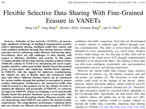 近日,开云信息工程学院博士生刘行在导师明洋教授的指导下,在网络与信息安全领域国际顶级期刊《IEEE Transactions on Information Forensics and Security》(中国计算机学会CCF A类、中科院1区Top期刊)发表论文“Flexible selective data sharing with fine-grained erasure in VANETs”。明洋教授为通讯作者,博士生刘行为第一作者,开云kaiyun官网为独立完成单位。