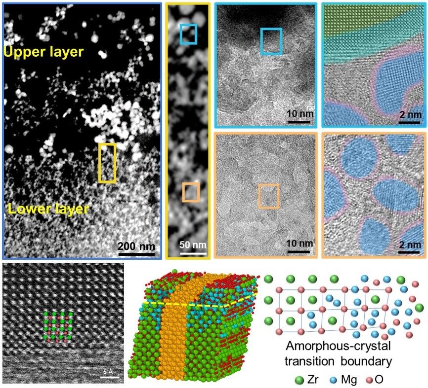 陶瓷材料应用中的一个主要挑战是强度和韧性之间的权衡。此研究通过构建多尺度异构结构陶瓷涂层(HSCC)来应对这一挑战。受天然贝壳启发,研究团队基于“砖-砂”纳米级结构,通过调控强化相(砖)和塑性相(砂)的成分和比例,在膜层中建立了微米级外强内韧的双层结构。研究发现,HSCC具有高达700°C的高相组成和结构热稳定性,与传统晶体涂层相比,其抗剪切应变能力提高了65%。锆原子稳定了增强相的边界,促进了顺应相的变形,使得分层结构能够通过同质相界面有效利用塑性相的变形能力和强化相的强度。这项研究为提高陶瓷功能复合材料的韧性和降低其脆断倾向提出了一种可行的设计和实现方法。