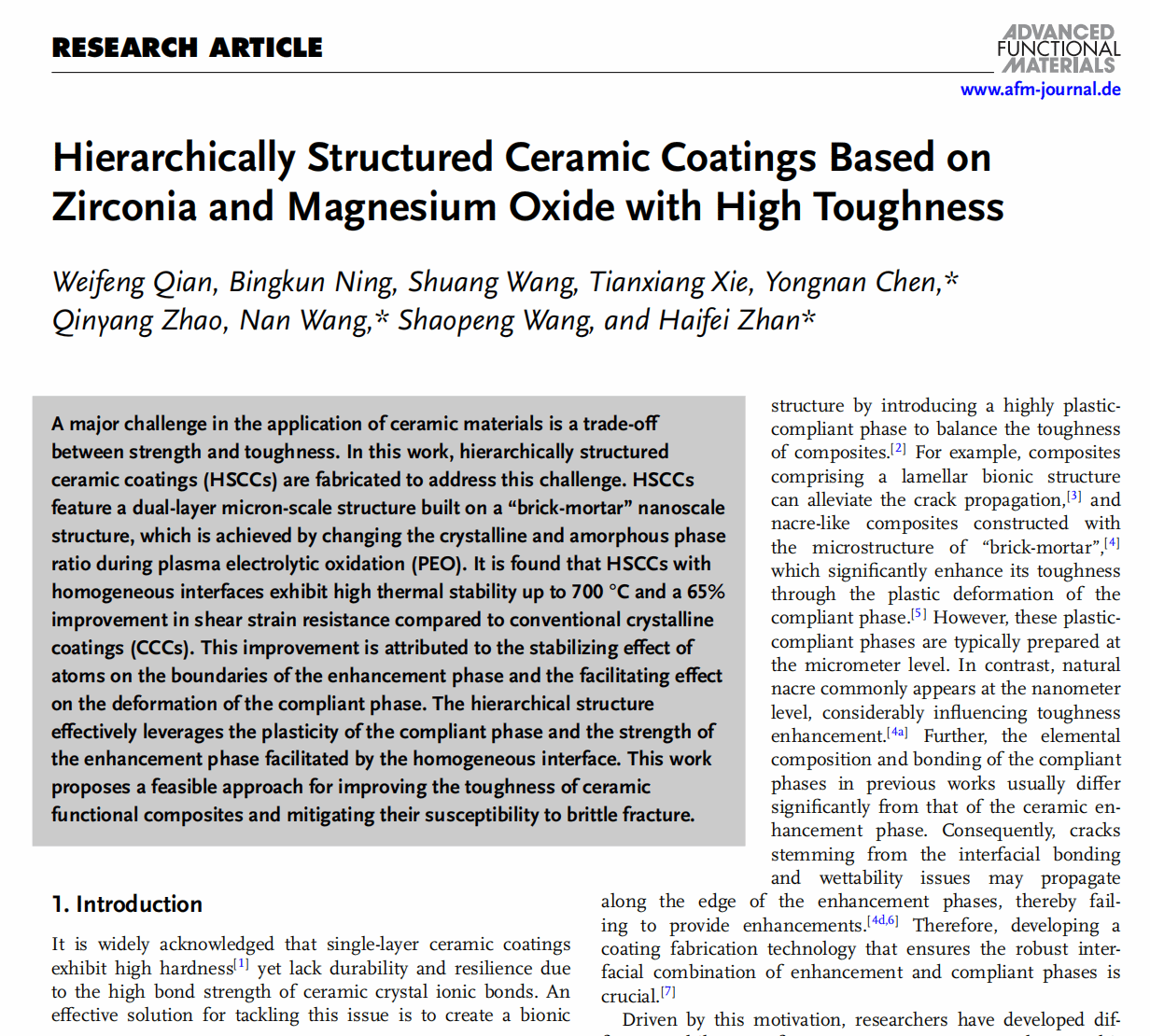 近日,开云材料科学与工程学院博士生钱伟峰等人在导师陈永楠教授的指导下,在材料科学领域国际期刊《Advanced Functional Materials》(中科院1区Top期刊,IF 18.5)发表论文“Hierarchically Structured Ceramic Coatings based on Zirconia and Magnesium Oxide with High Toughness”。陈永楠教授为第一通讯作者,开云kaiyun官网为第一通讯单位。